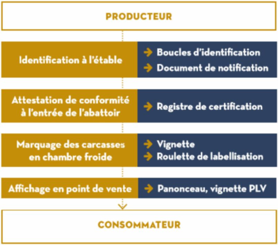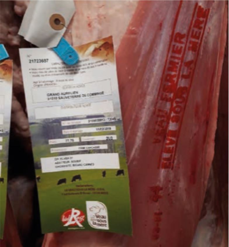 La traçabilité est assurée à toutes les étapes de la chaîne. Cela démarre en élevage, ou l’exploitant doit boucler ses animaux, c’est-à-dire qu’il attribue un numéro à chaque animal. Le veau possède également un passeport sur lequel sont inscrites toutes les informations le concernant. Ce document suivra le veau puis sa carcasse tout au long de la chaîne de transformation. Ensuite, en abattoir, on fixe une vignette sur les carcasses labellisées. Ces dernières sont ensuite « roulées » afin d’avoir un marquage visuel sur la carcasse.