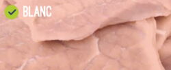 En ce qui concerne la couleur, il existe 5 classes, allant de 0 à 4. La note est attribuée après un jugement visuel, au niveau de la bavette. Les classes de 0 à 3 sont autorisées au Label. Cependant, l’objectif est d’obtenir une carcasse la plus blanche possible. La couleur est une composante provenant de la demande des consommateurs. En effet, pour la grande majorité des consommateurs, la viande de veau est une viande blanche. La différence de prix est importante selon les différentes classes de couleur. C’est pour cette raison qu’il est essentiel de maîtriser ce paramètre. Cependant, obtenir des veaux clairs n’est pas facile car de nombreux facteurs peuvent jouer sur la couleur de la viande (génétique, ambiance des bâtiments, alimentation troupeau et des veaux, conduite sanitaire, etc.).